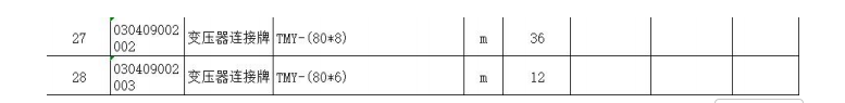 清单中变压器连接排有两种型号分别是80*8数量是36米和80*6数量是12米。截图如下: