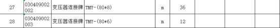 清单中变压器到低压进线柜用的是铜排链接,铜排型号为:80*8数量是 36米和80*6数量是12米。截图如下: