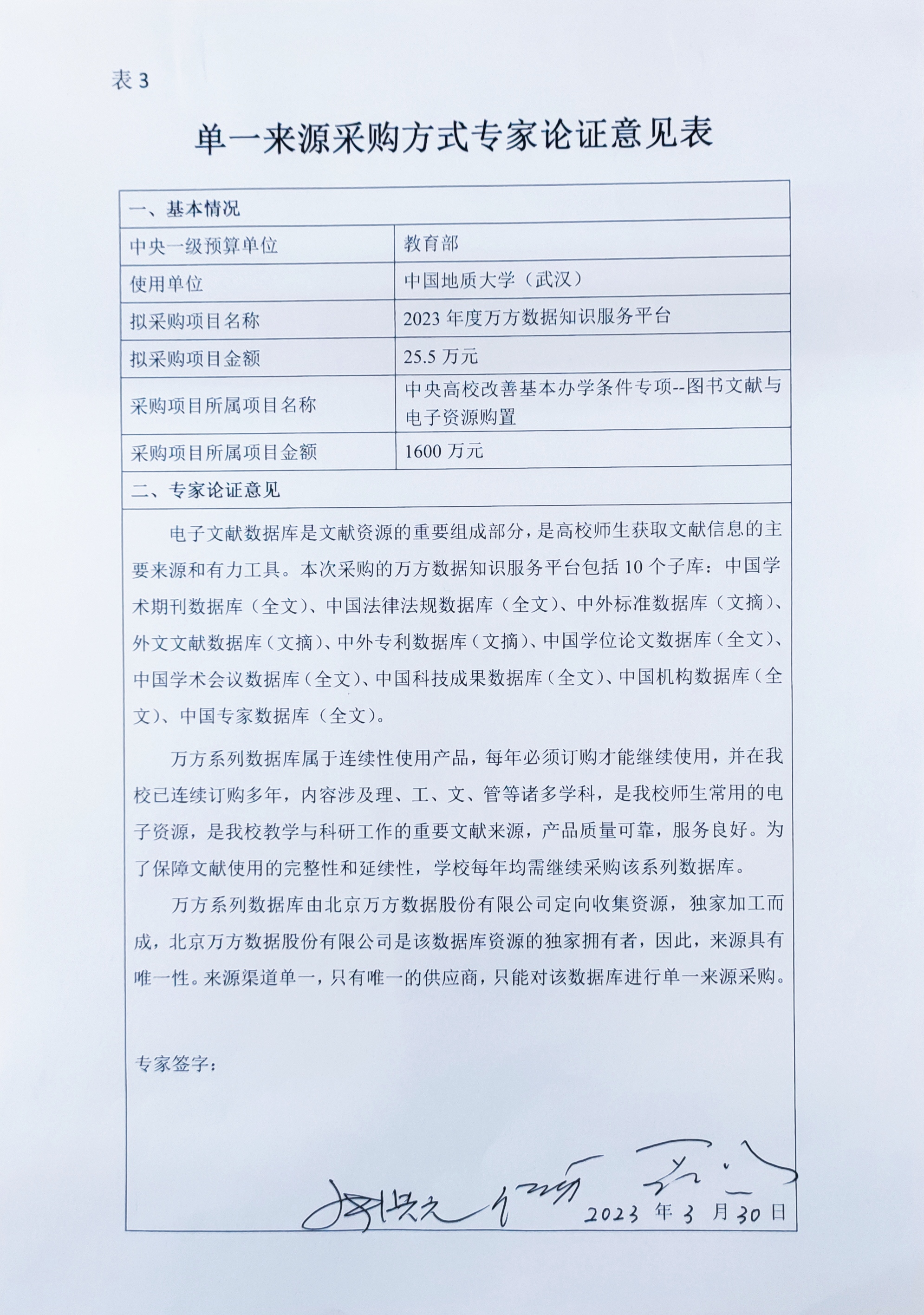 中国地质大学(武汉)拟对2023年度万方数据知识服务平台进行采购,使用单位申请采用单一来源方式采购,现予以公示: